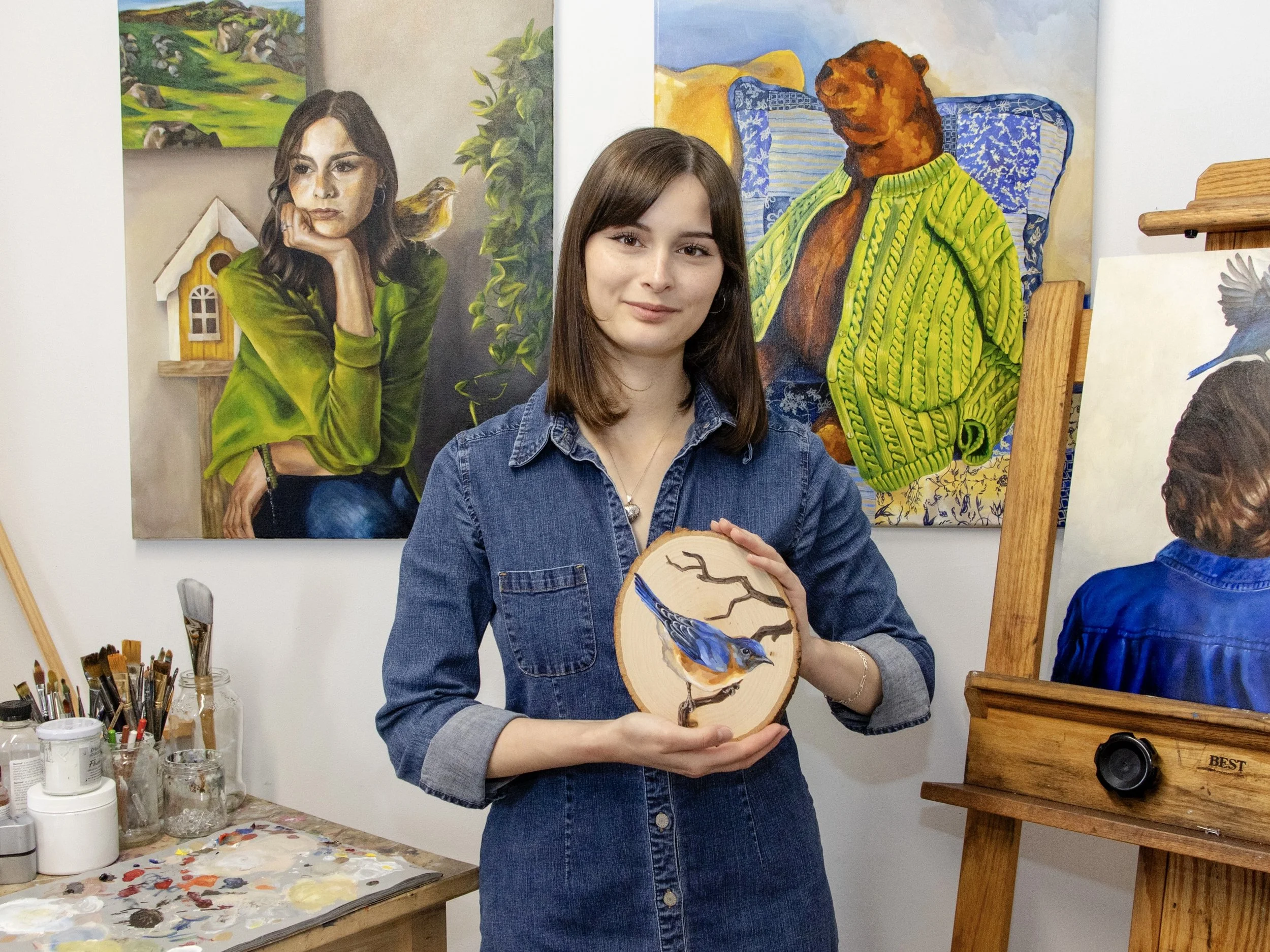 Through painting, I explore the formation of sentimental bonds between people and possessions, and how our interests and styles are rooted in personal history. With a mixture of figure, object, and pattern, I portray how physical objects can be imbued with love, purpose, and life. Like small snapshots, I memorialize the parts of my life that I treasure, like the clothing in my closet, the decor on my windowsills, and the birds I encounter day-to-day.